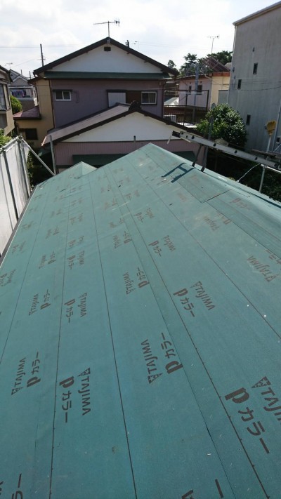 屋根の葺替え工事を行いました。 木下地が朽ちていたため、一部解体し下地補修。 その後、ルーフィング工事(防水シート貼り)を行い、ガルバリウム鋼板を施工しました。 ガルバリウムは、素材がかるく、通常の瓦屋根に比べ、10分の1の重さです。 そのため、地震に対する揺れを緩和することができ、耐震性を向上させることができます。 また鉄のイメージが強いですが、最近のものは遮熱性や断熱性に優れています。 2017年08月